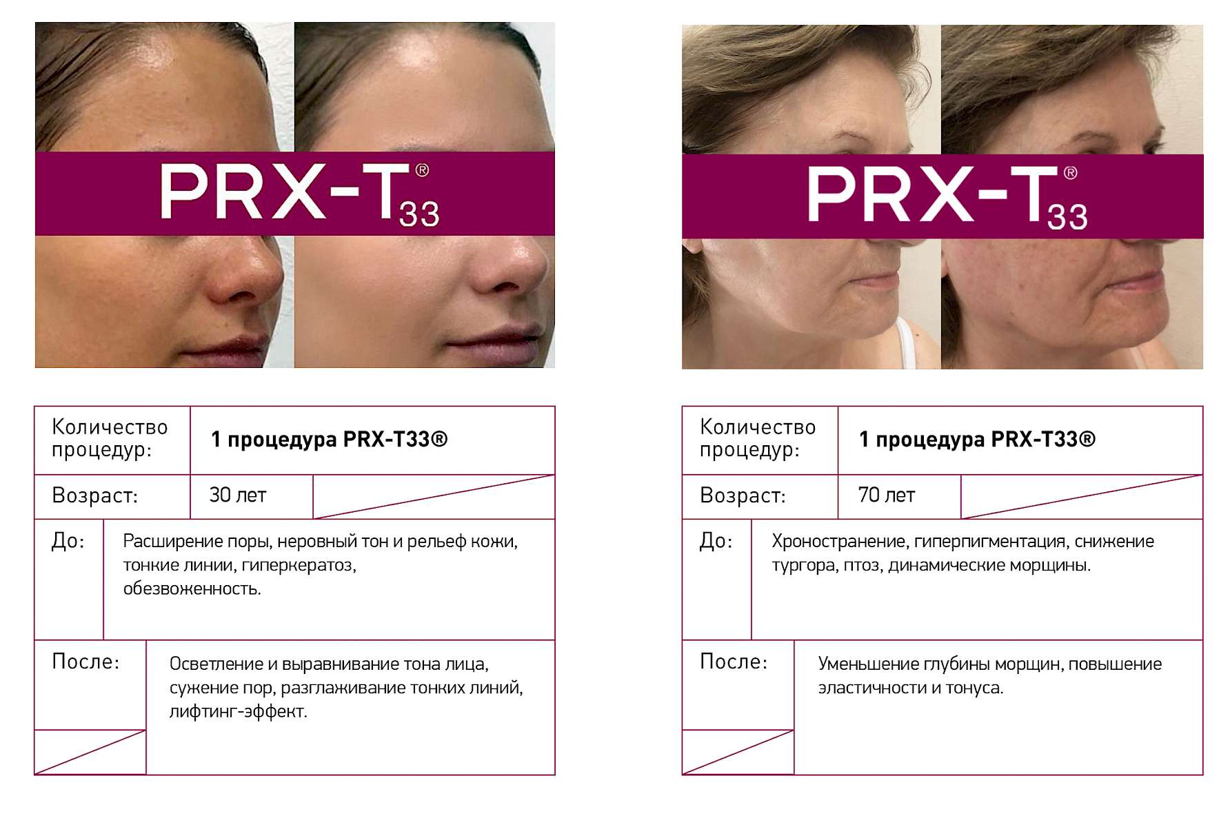 PRX-T33® - это комплексная программа профессиональных процедур и домашнего ухода для активного естественного восстановления и омоложения кожи, в результате которой не повреждается эпидермис, но формируется новый коллаген и обновляется структура клеток. PRX-T33® терапия - это сенсационное открытие в эстетической медицине: запатентованная гибридная молекула PRX-T33® , проникая до сосочкового слоя дермы, запускает целый каскад реакций, глубоко стимулируя кожу.