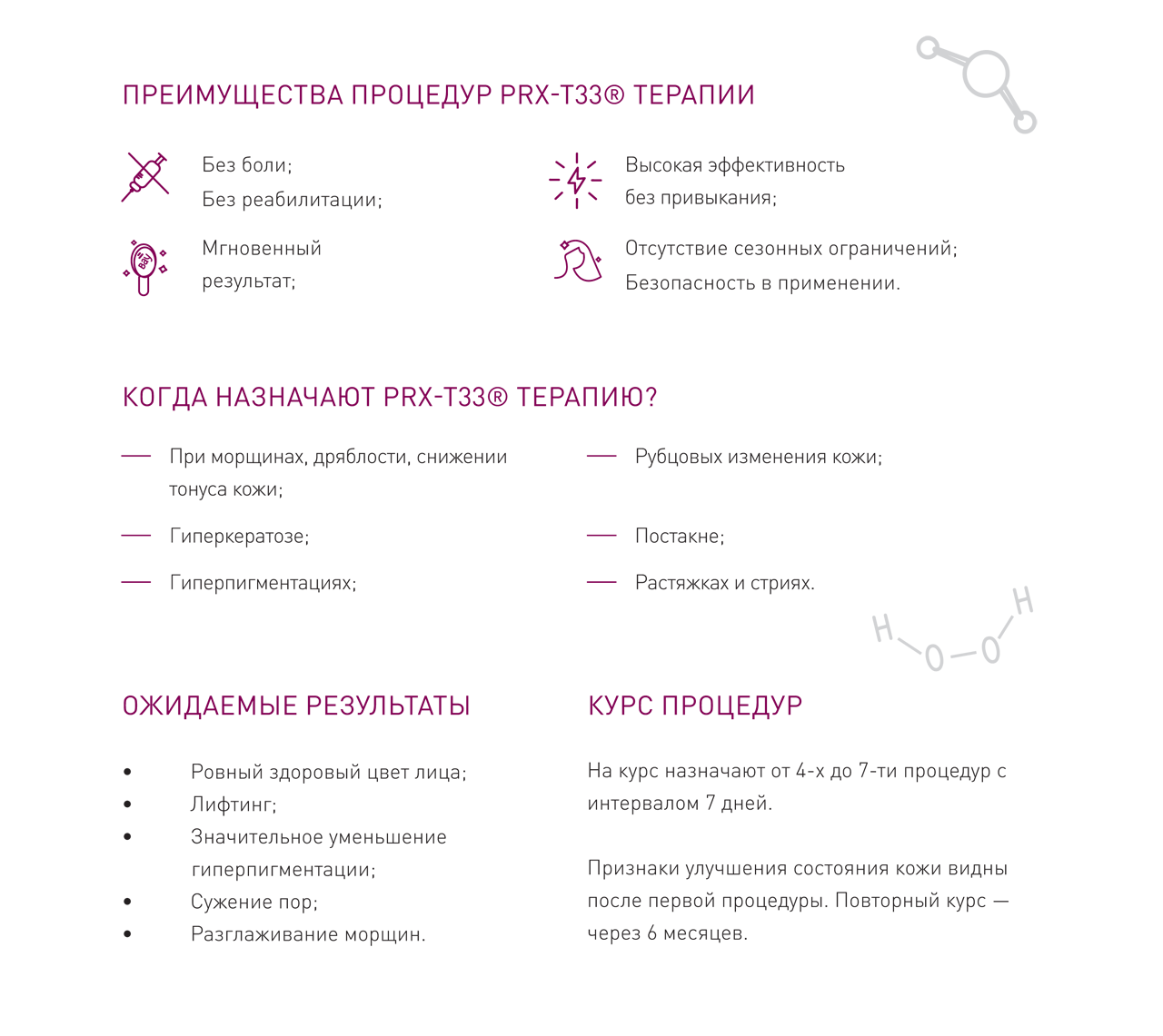 Две субстанции - запатентованный комплекс PRX-T33® и H2O2, - синтезированные в новое вещество, дополняют друг друга, давая непревзойденный результат круглый год без реабилитации. PRX-T33® терапия дает сильнейший ревитализирующий эффект, стимулируя синтетическую функцию дермы без повреждения эпидермиса.